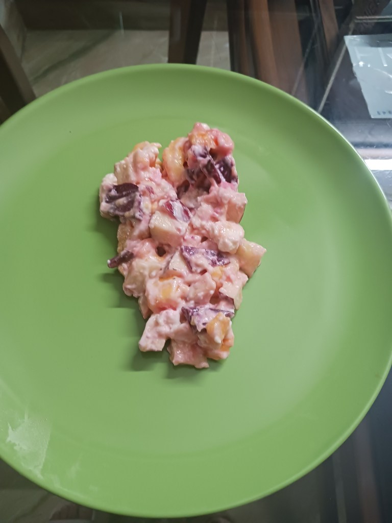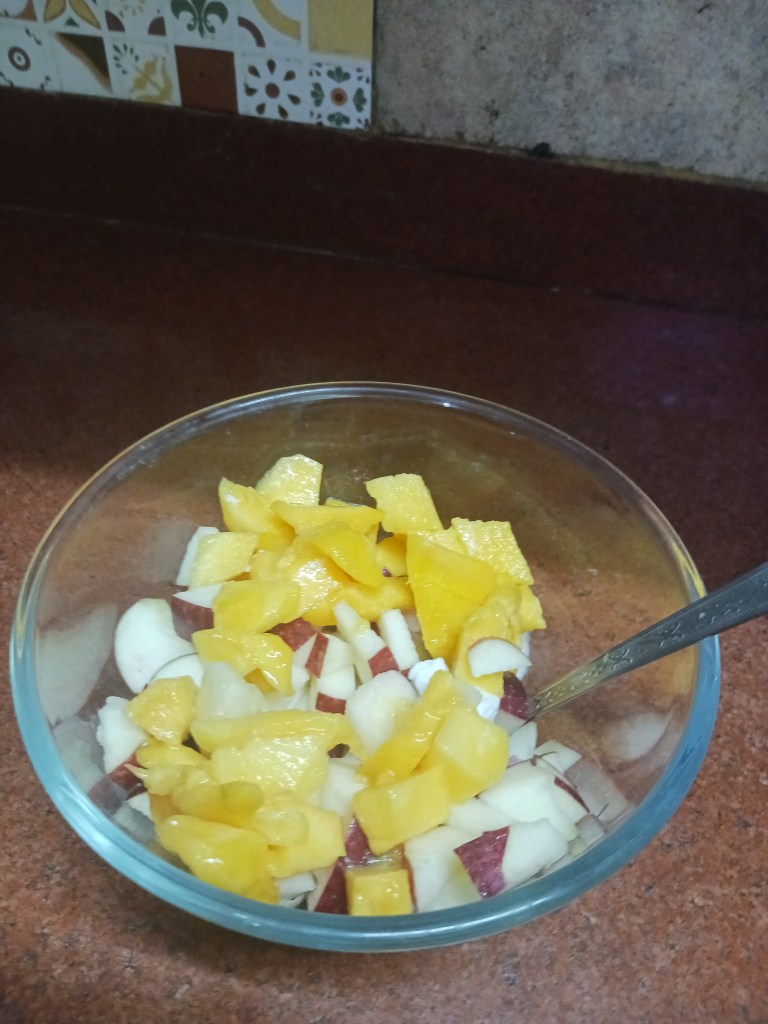 Ingredients: 1 apple, 1 ripe mango, 1 unripe green small mango ( in case you like sour and sweet taste), 1 beetroot, 50 gram cottage cheese, mayonnaise.