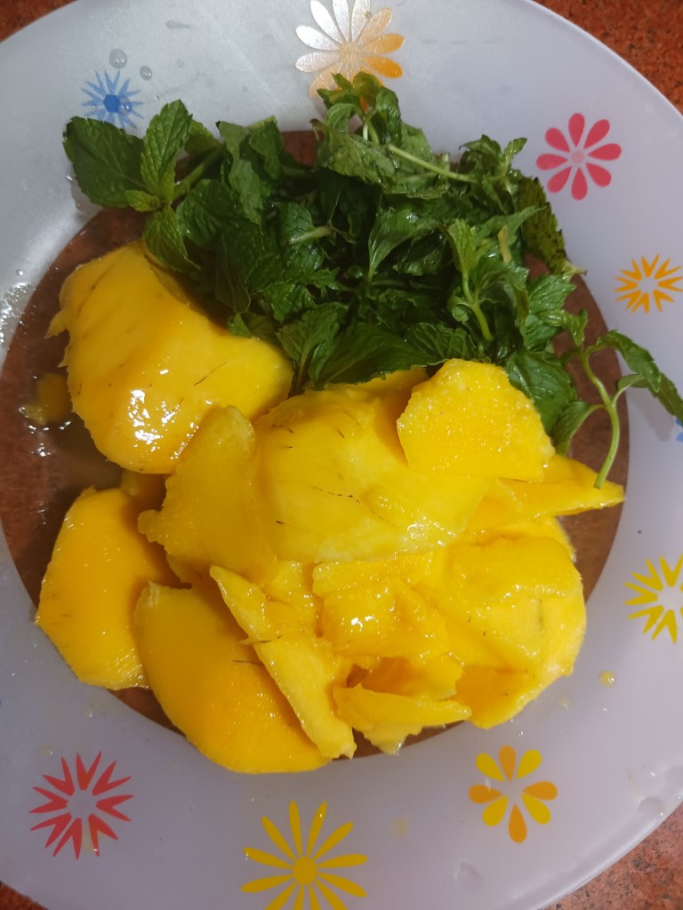 Step 2. Take mint wash it, peel of mango after washing it and cut it in small parts.