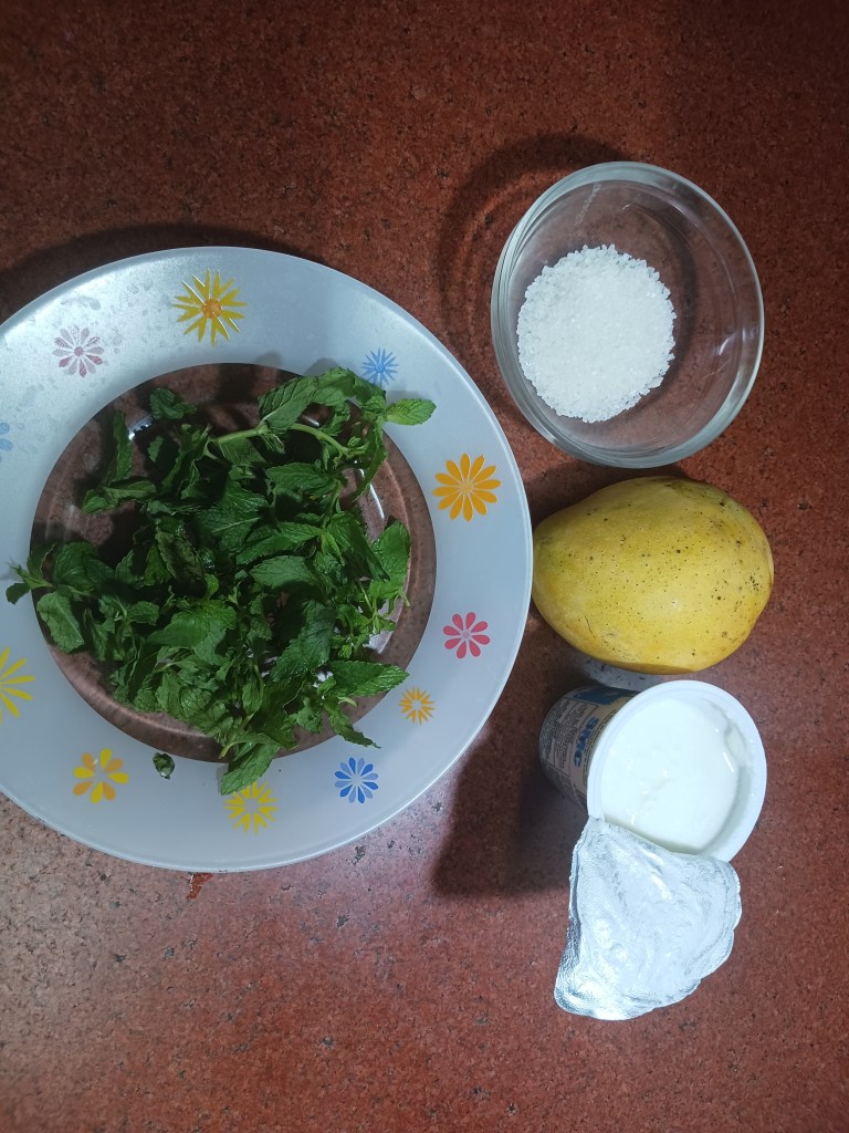 Step 1. Take raw materials for the cool homemade drink. Take 1 ripe mango, 1 cup of curd, handful of mint, 2 spoon sugar and ice cubes and 2 cup of water.