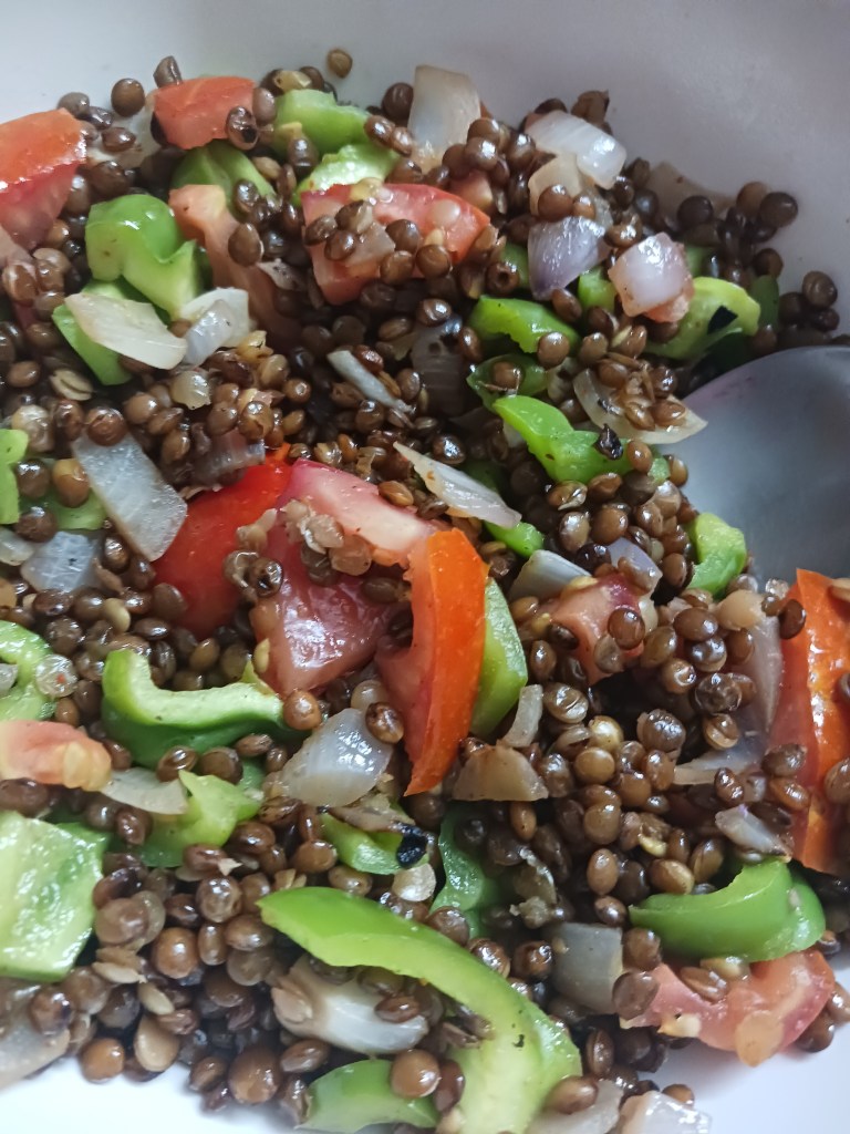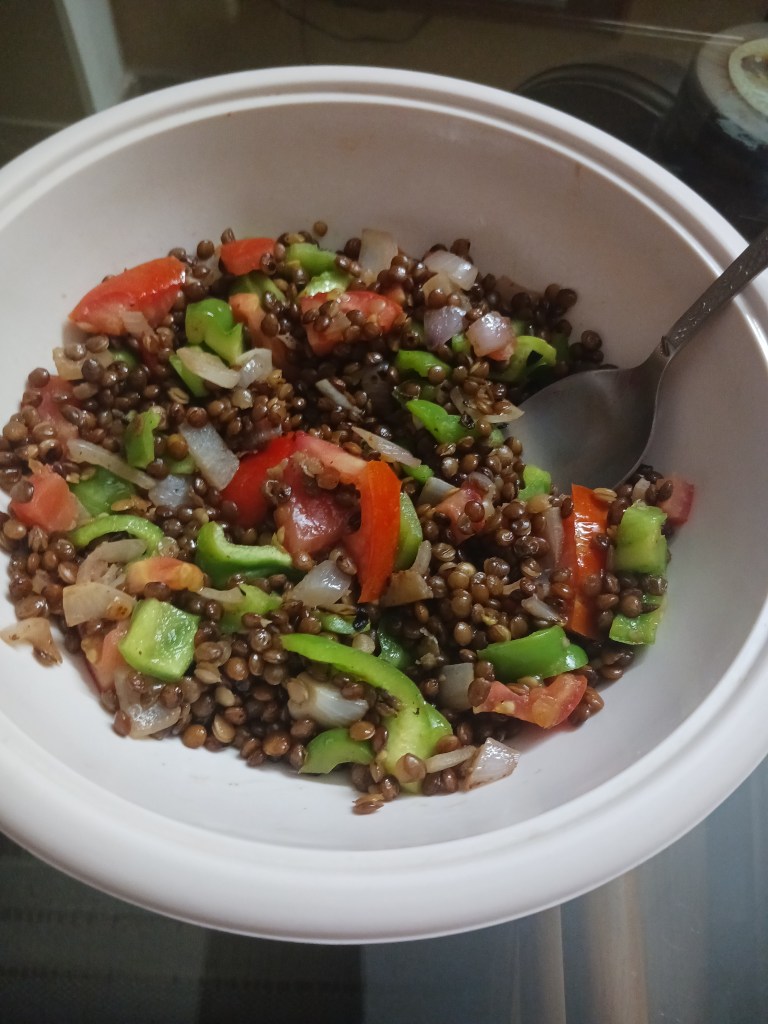 Ingredients: Half cup brown lentil, 1 capsicum, 1 onion, 1 tomato, salt, red chilli, black pepper, half lemon is optional.