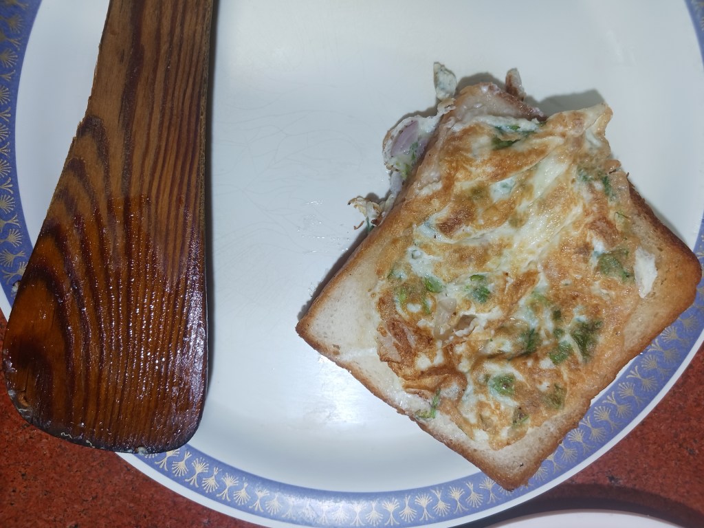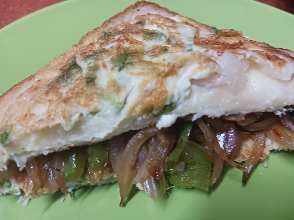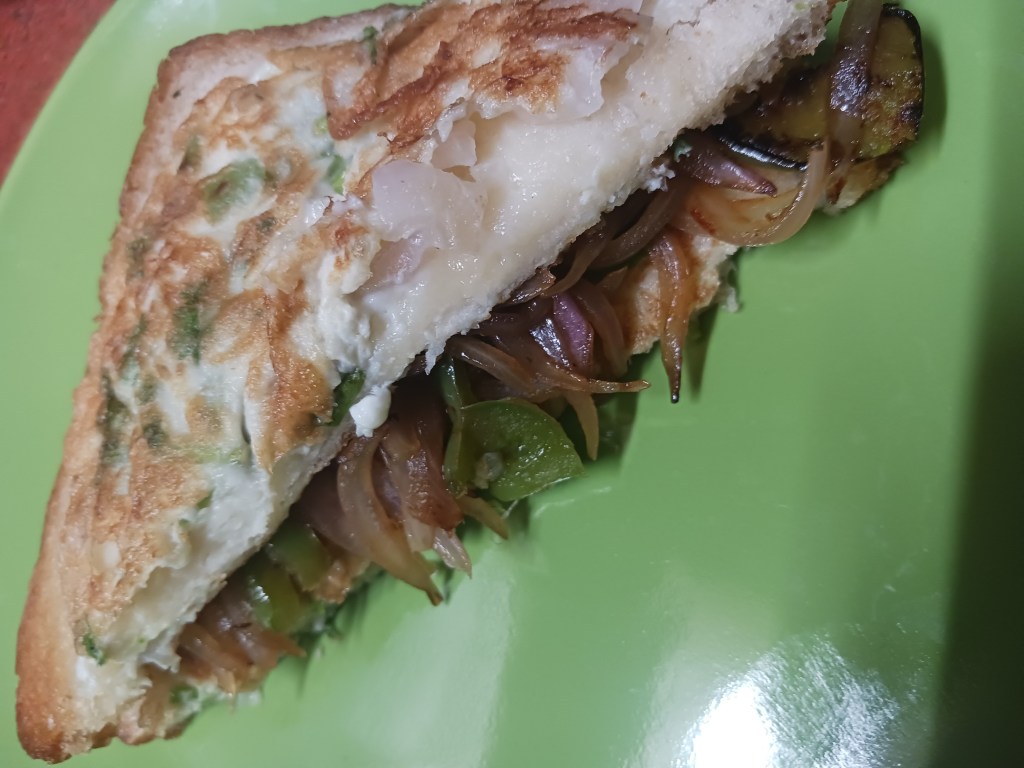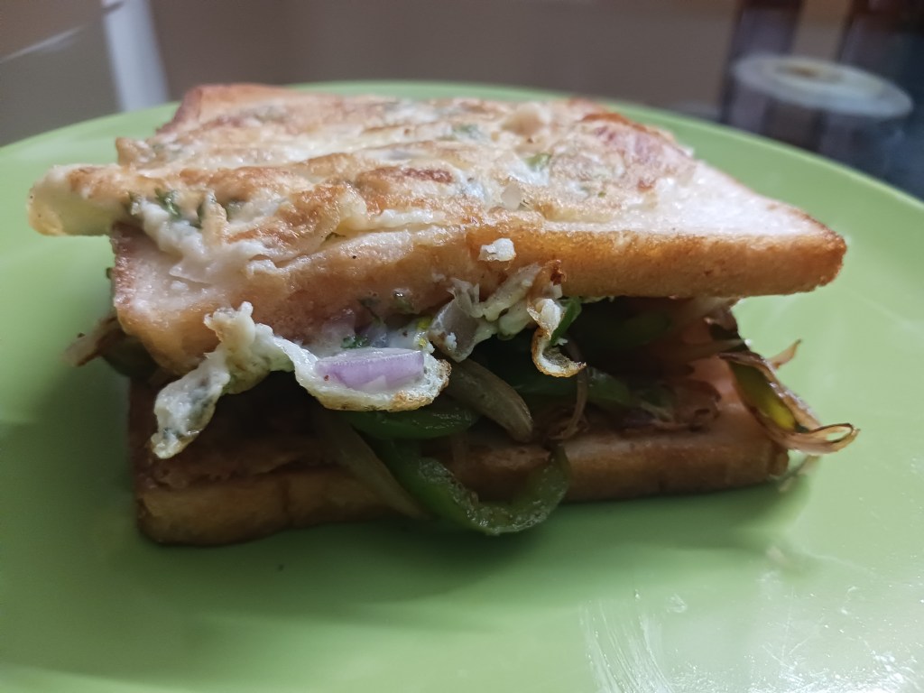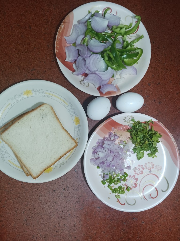 Ingredients: 2 onions, one medium size another small, one green chilli, 2 eggs, 2 breads, 1 medium sized capsicum, salt, red chilli, butter, clarified butter. That’s it.