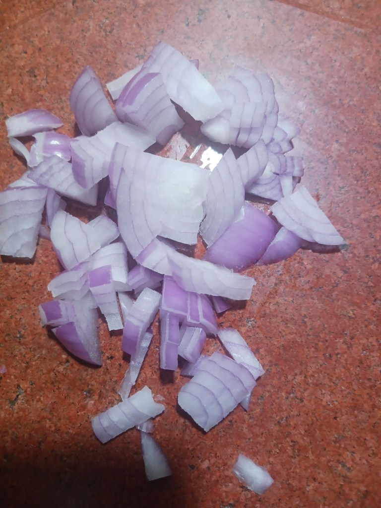 Step 2. Cut one onion in very small parts till potatoes are boiling.