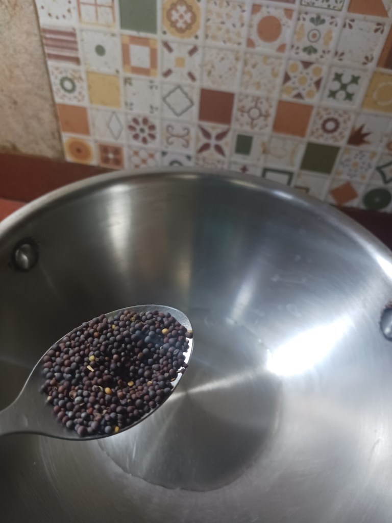 Step 5. Add 1 spoon of mustard seeds in pan. Keep moving the ingredients of pan by mixing.