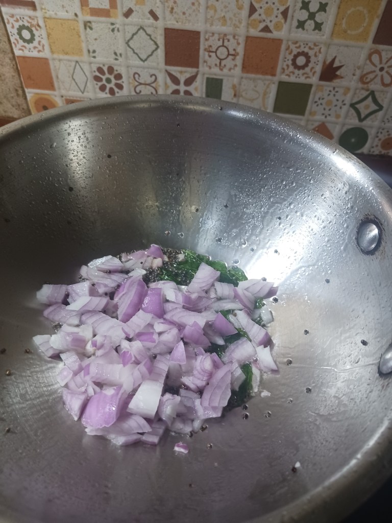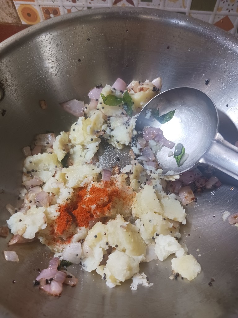 Ingredients: 2 potatoes, 1 onion, 1 spoon mustard seeds, few curry leaves, cooking oil, salt, red chilli.