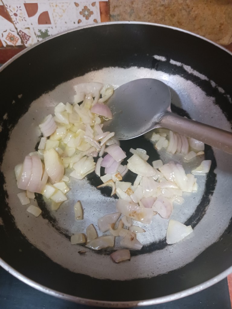 Step 4. In the meantime cut one onion. Put this onion in frying pan with 1 spoon of heated oil.