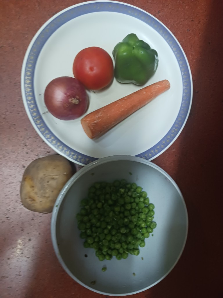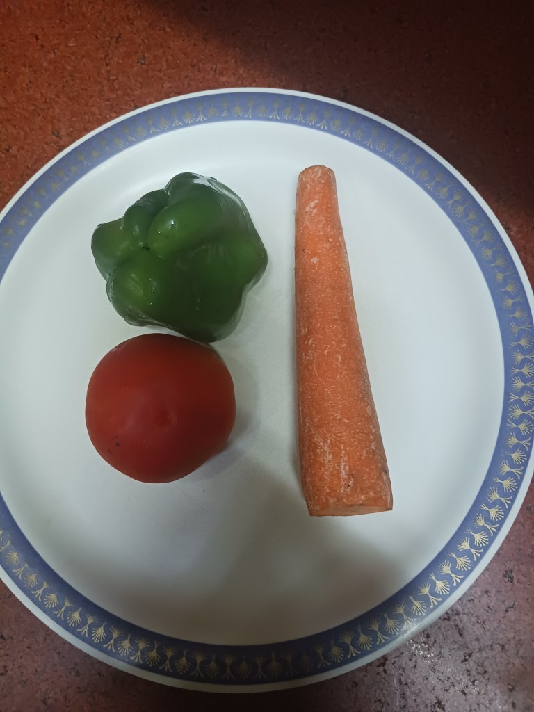 Step 1. Take ingredients for vegetables stew. I had these vegetables for stew, one carrot, one capsicum and one tomato.