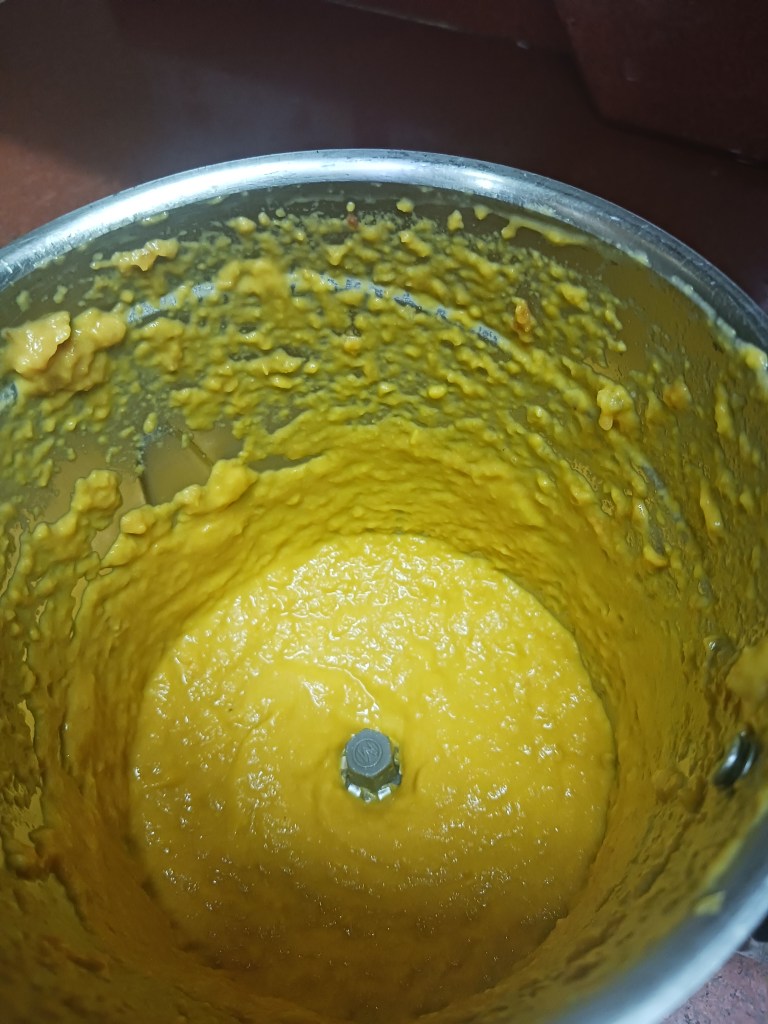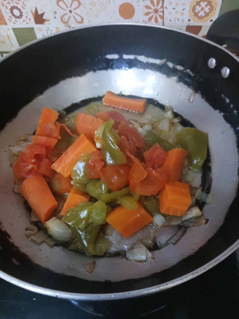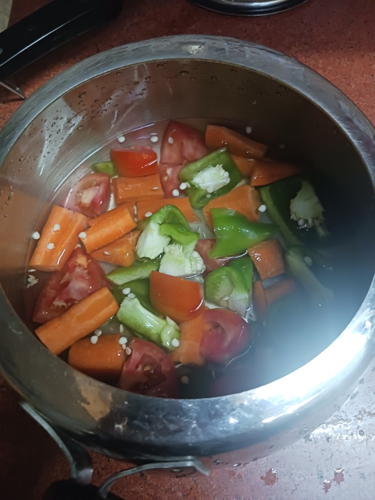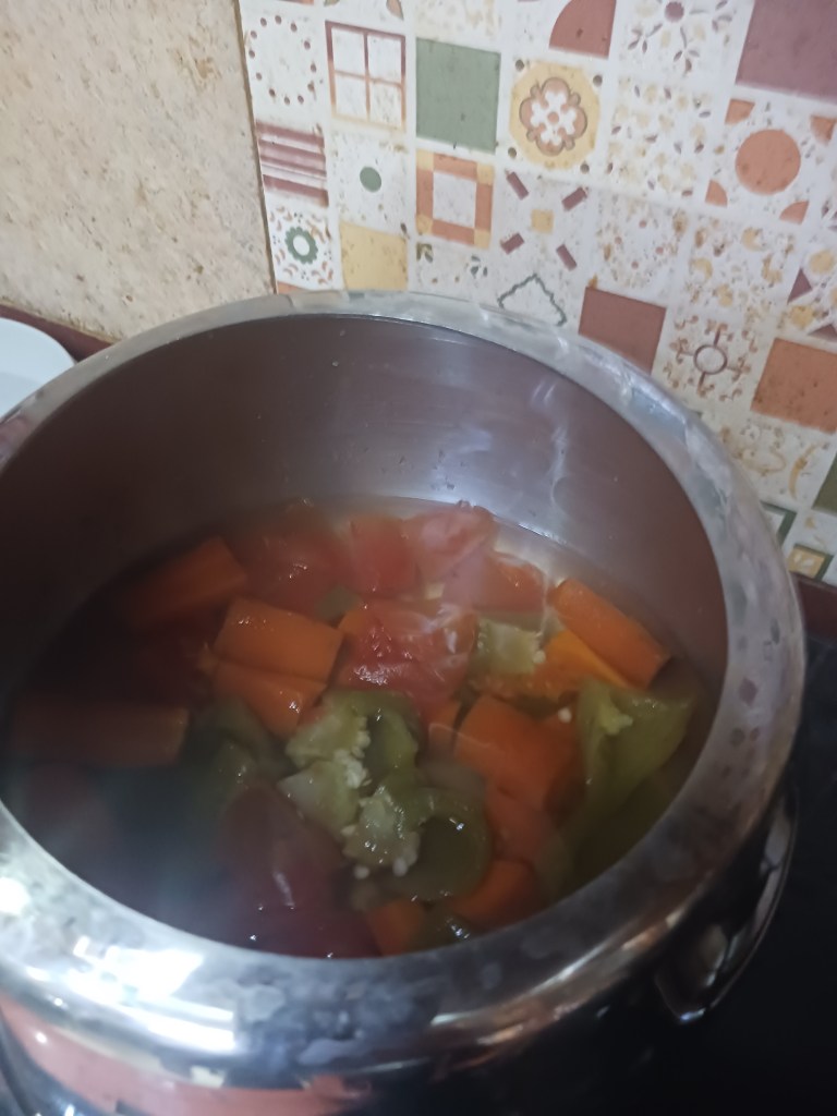 Step 10. As the green peas are in cooker. In the mean time, add the boiled cut vegetables in frying pan, this includes onion, put it all, carrot, capsicum, tomato in mixture grinder. Grind it, it would become a paste as follows.