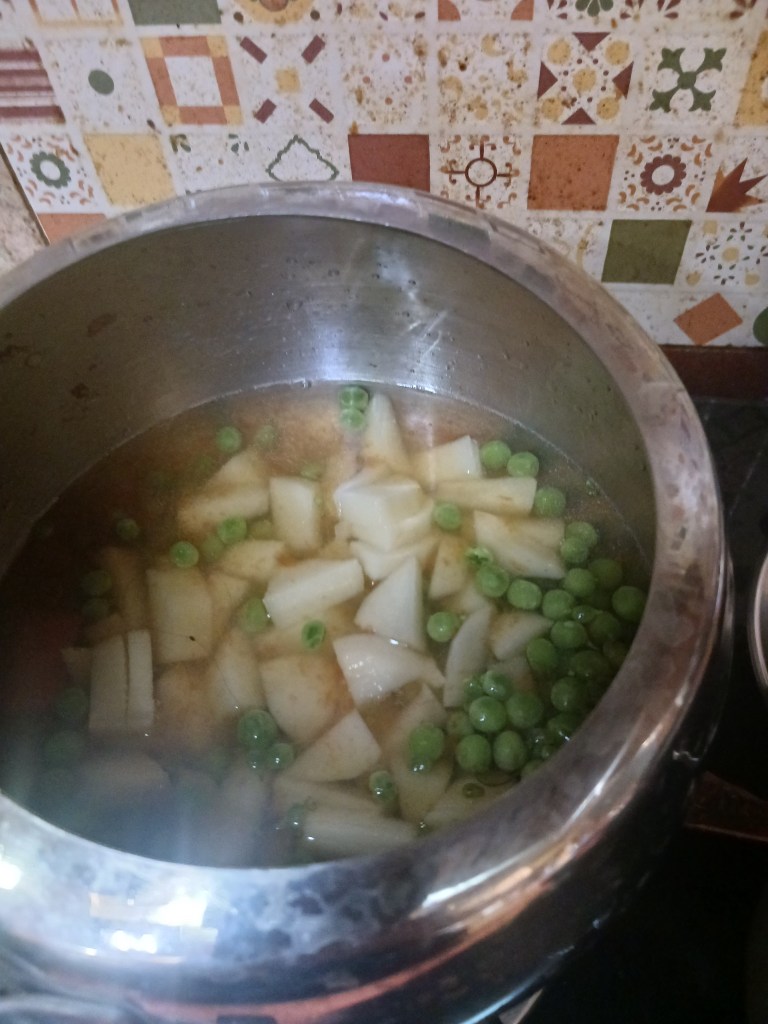Step 9. Add cut potato and handful of green peas in the same cooker on slow heat in same vegetable broth. Give it one whistle.