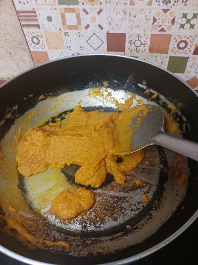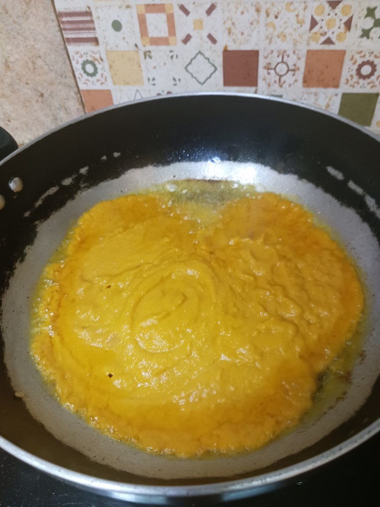 Step 12. Once oil is heated means fumes come, add the vegetables paste in frying pan.