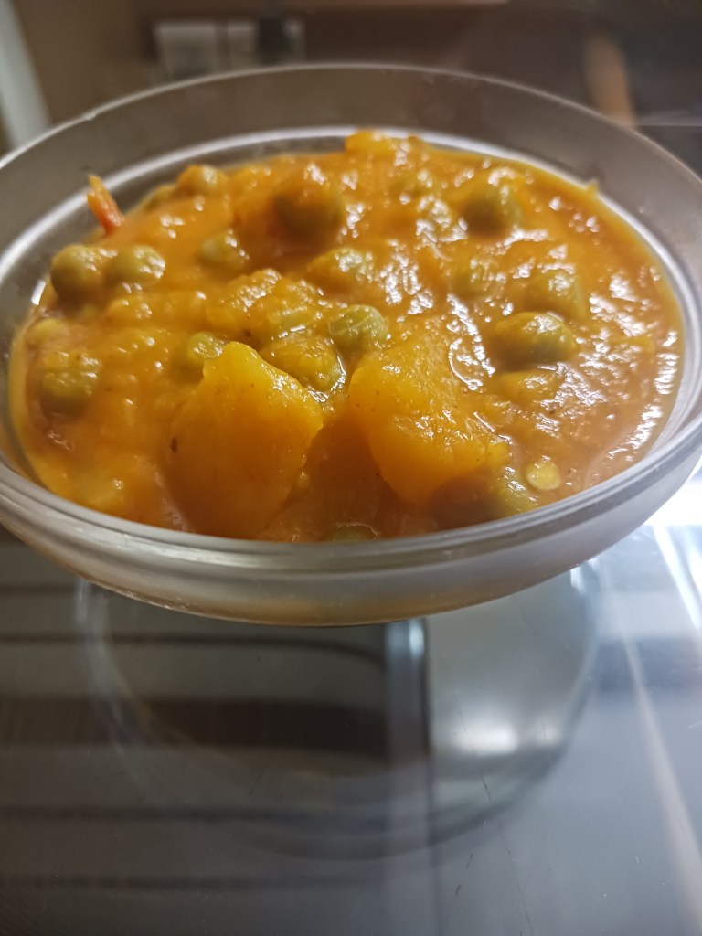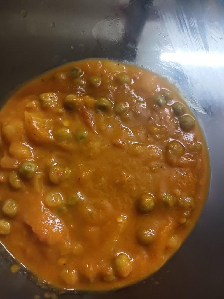 Here is an innovative recipe where Green Peas is cooked with vegetable purée instead of tomato purée. A version of this dish is famous in northern India when made with tomatoes purée.