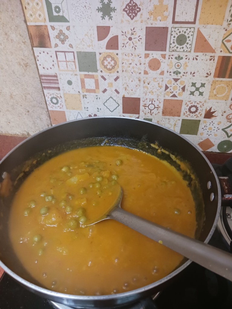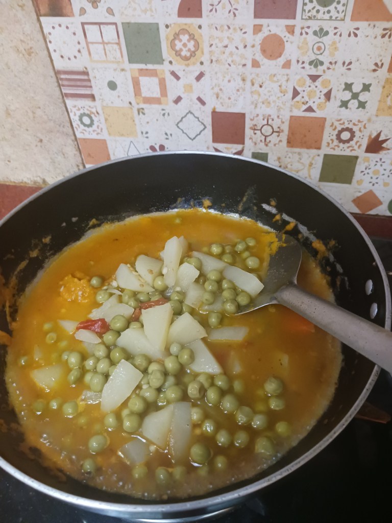 Step 14. It’s ready, add the contents of pressure cooker in the above frying pan. This means add boiled green peas and boiled potatoes with the same broth water in which all vegetables were boiled, add it in frying pan.