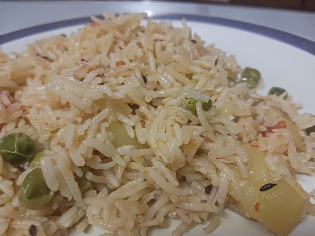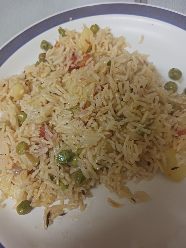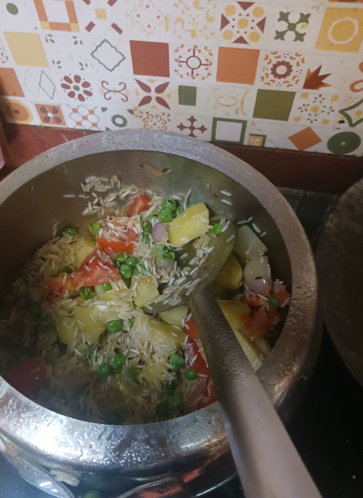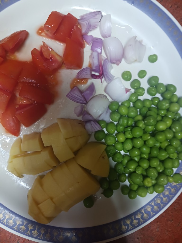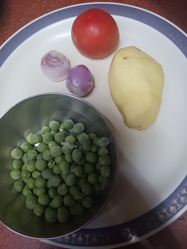 Ingredients: Handful of Green Peas, rice, 1 potato, 1 tomato, 2 small onions, salt, red chili.