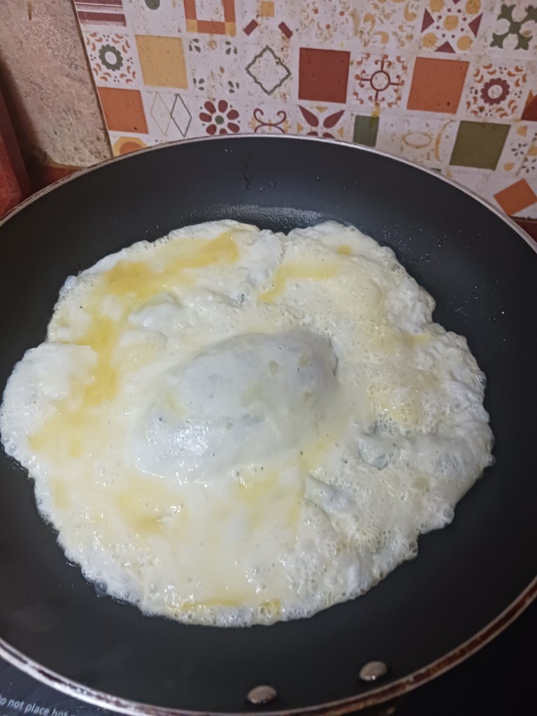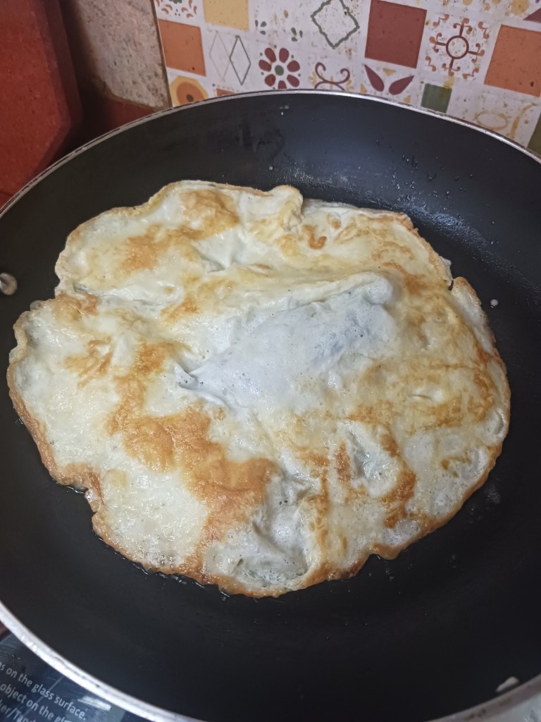 Step 6. Flip the side of omelette on pan, to cook from other side. Note I like fully cooked omelette you may go to step 7 in case you like semi cooked omelette.