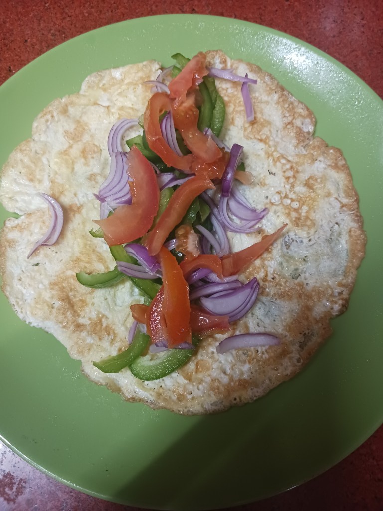 Step 7. Take omelette on a large plate and put the vegetables you chopped in middle of the omelette.