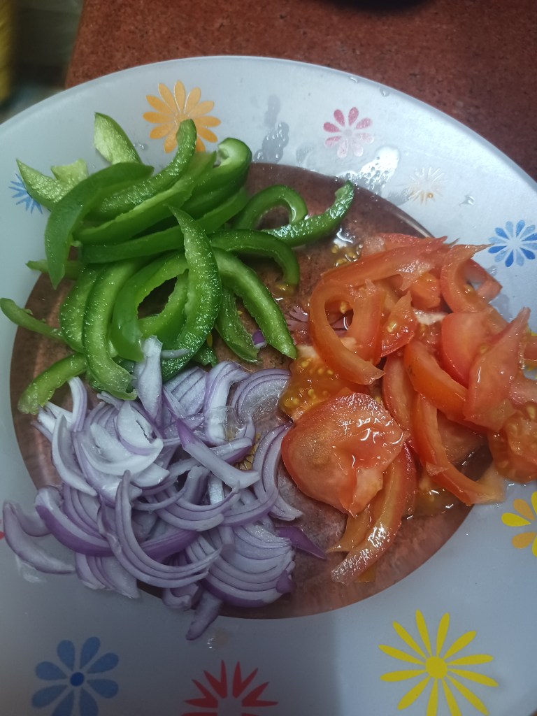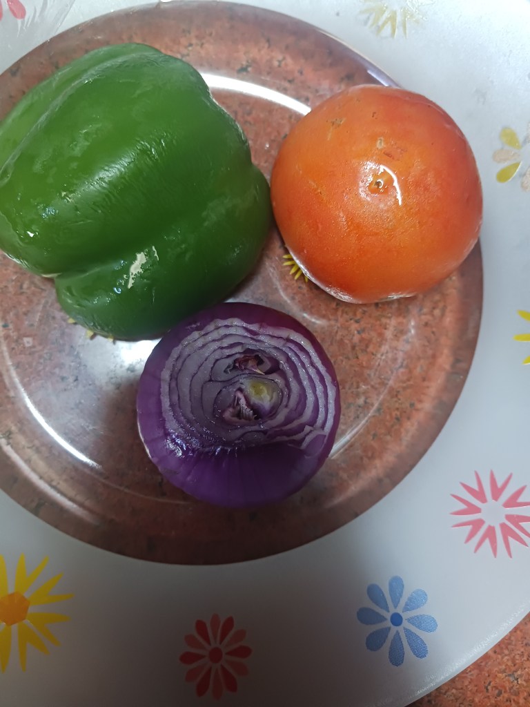 Step 1. Wash the veggies you selected. I used one capsicum, one onion and one tomato.