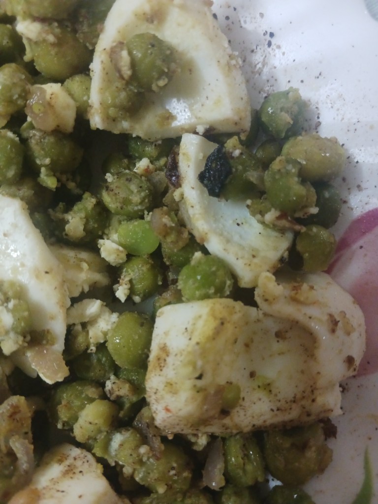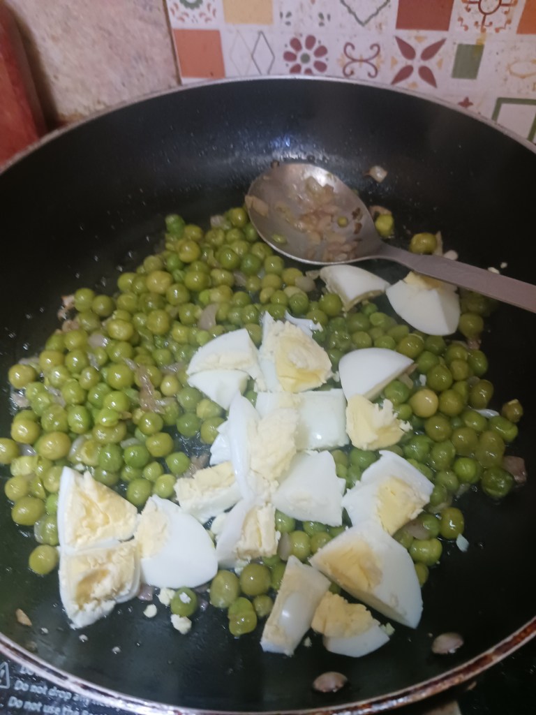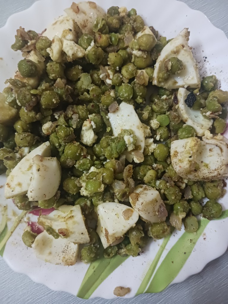 Ingredients: 2 eggs, 1 bowl of green peas, one small onion, one serving spoon of oil, salt, black pepper and red chill as per taste. That is all.