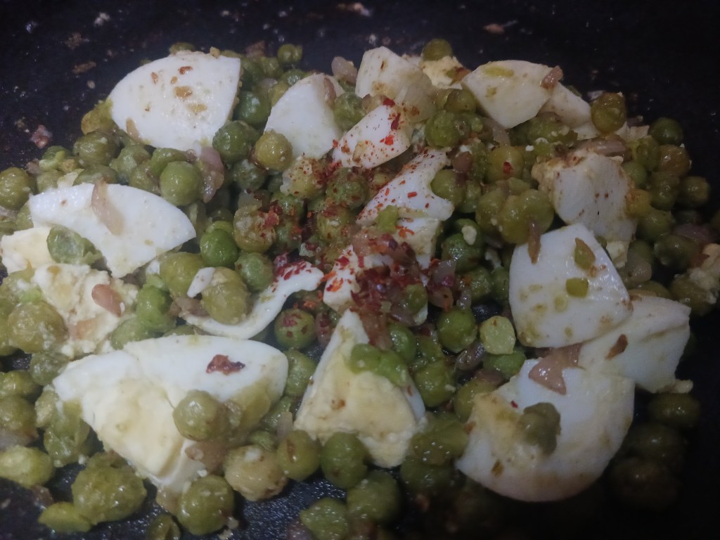 Today a egg mashup recipe with a difference. Why boiled eggs only all time? Here, is Mashup recipe for you all to enjoy, it is mashup of green peas with boiled eggs, flavored with salt, black pepper and red chili.