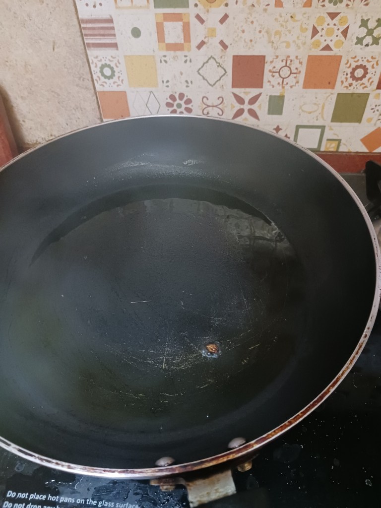 Step 5. Take a pan and put one small serving spoon of cooking oil in it. Heat it.