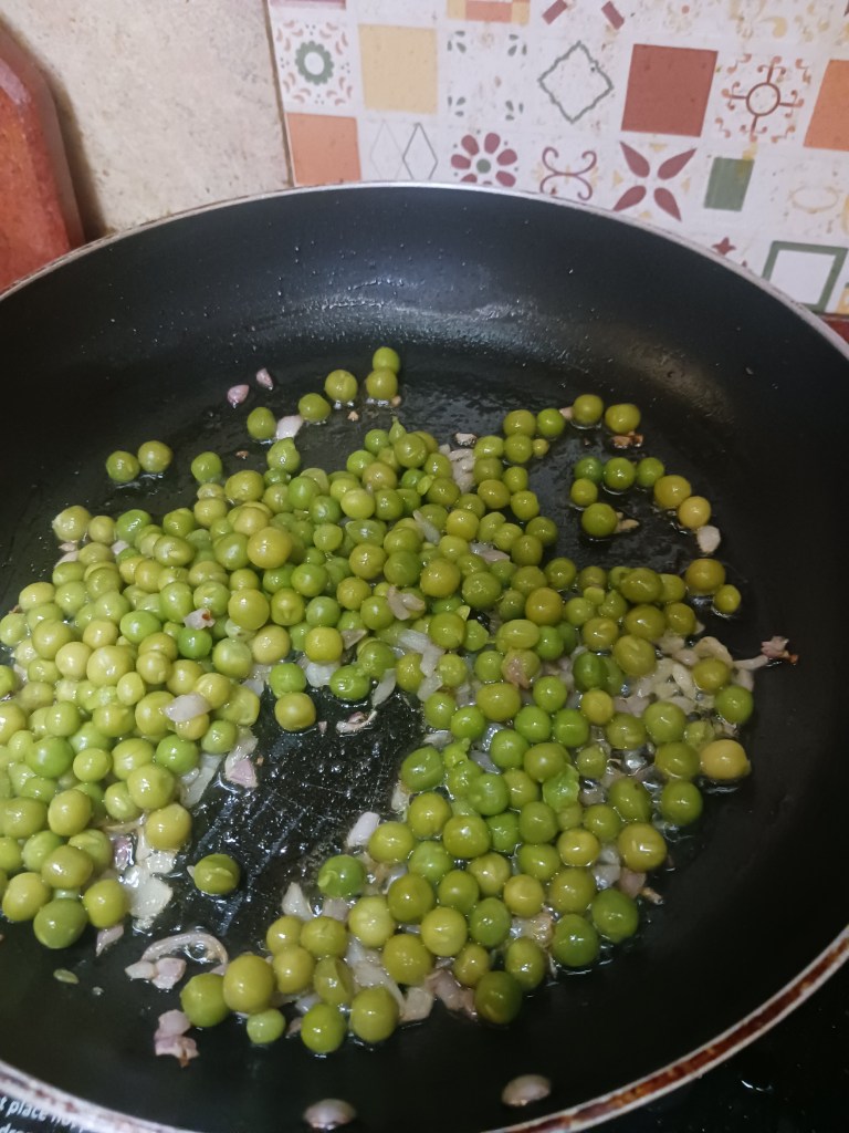 Step 7. Now, add boiled green peas to the pan.