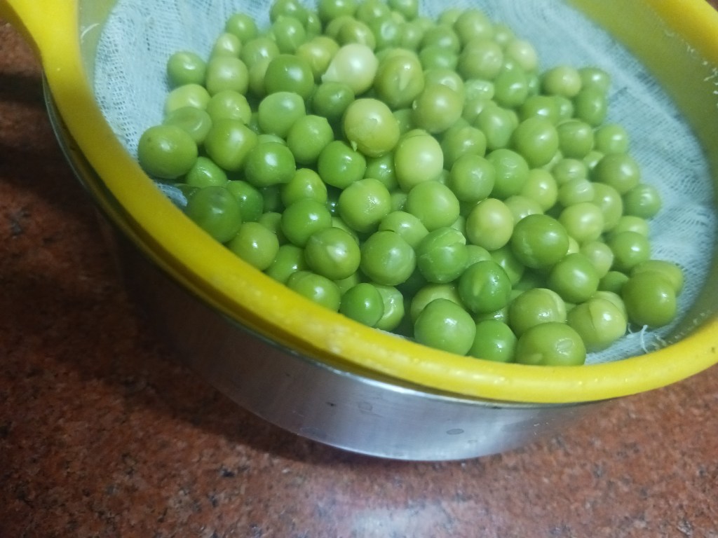 Step 2. Take 1 bowl of green peas. Put it to boil for 2 cooker whistles in equal amount of water. Wait for gas to come out of cooker naturally. Do this while eggs are set to boil.