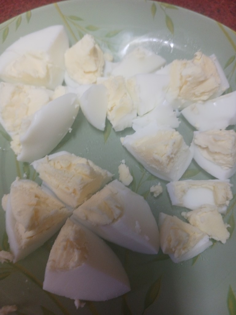 Step 1. Boil 2 eggs. I boiled it in steel bowl filled to top on high heat for 15 minutes, if you like partially cooked eggs take it out sooner than 15 minutes. Peel it and cut it into small parts.