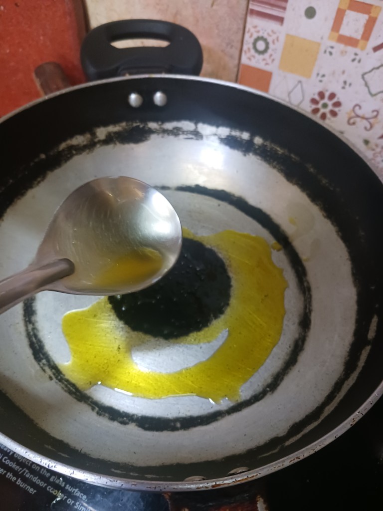 Step 6. Heat the oil, when heated add spices as per like, I added black pepper and salt, you may add some ginger garlic paste as well, for added flavor.