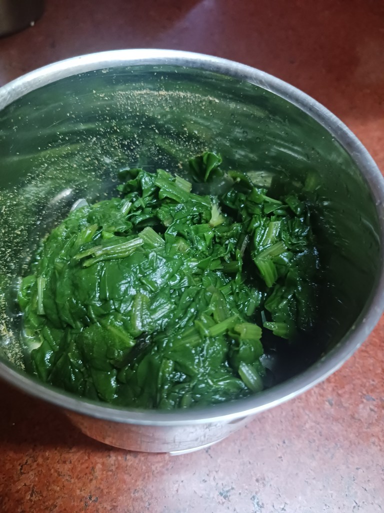Step 1. Take a handful of freshly cut spinach, add half bowl of water and heat it a utensil for 10 minutes. Make sure spinach does not dry out.
