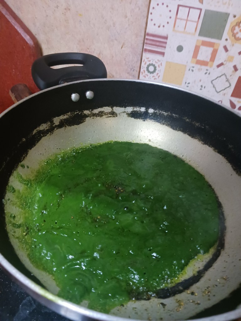Step 7. Now empty the grinder spinach in mixture grinder to the pan.