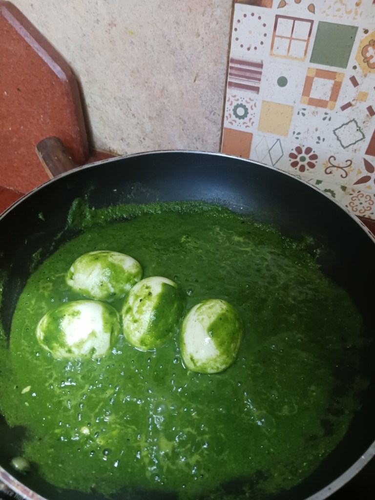 Step 8. Add boiled eggs in the pan now, add some water if the spinach mixture is getting dry. Mix well, don’t let pan get dry. Heat for 2 minutes with added water.