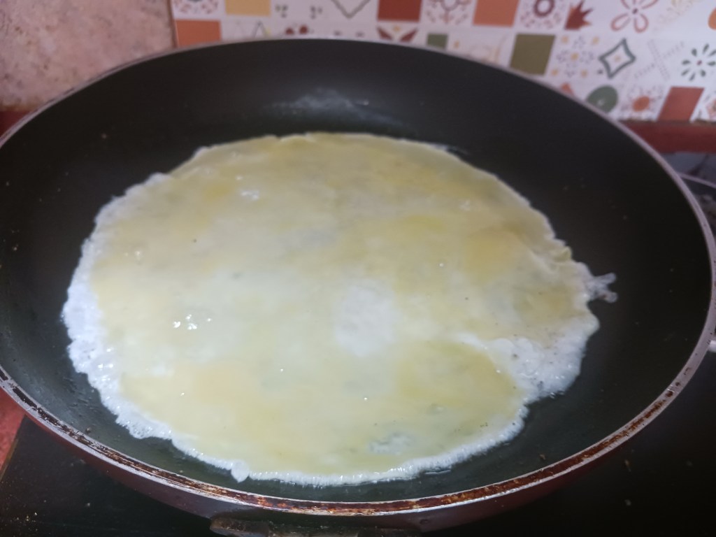 Step 18. Spread it well on pan, let it heat and pour in the beaten eggs on frying pan now, spread the egg on pan to sides.
