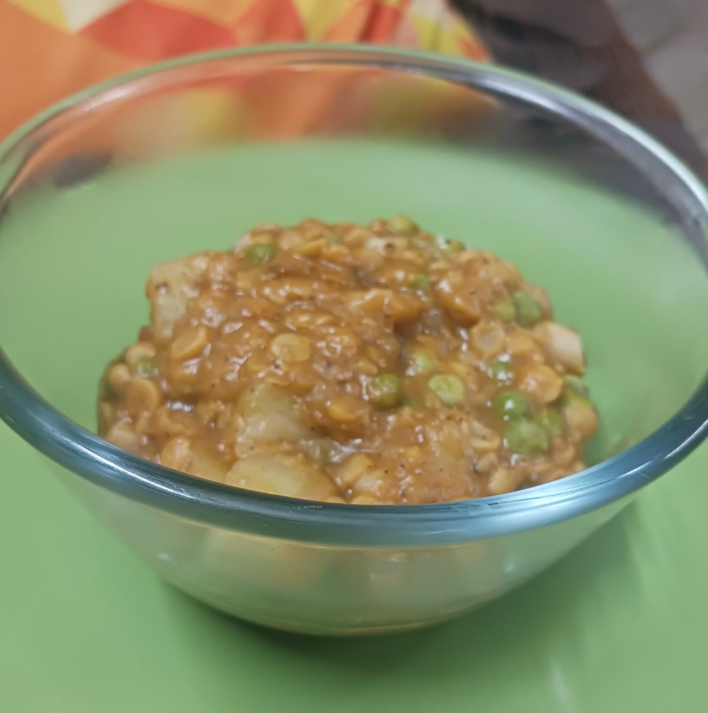 Ingredients: One bowl of green peas, one bowl of chickpeas split lentils, one onion, 2 tomatoes, one potato, black pepper, salt, red chili, cooking oil.