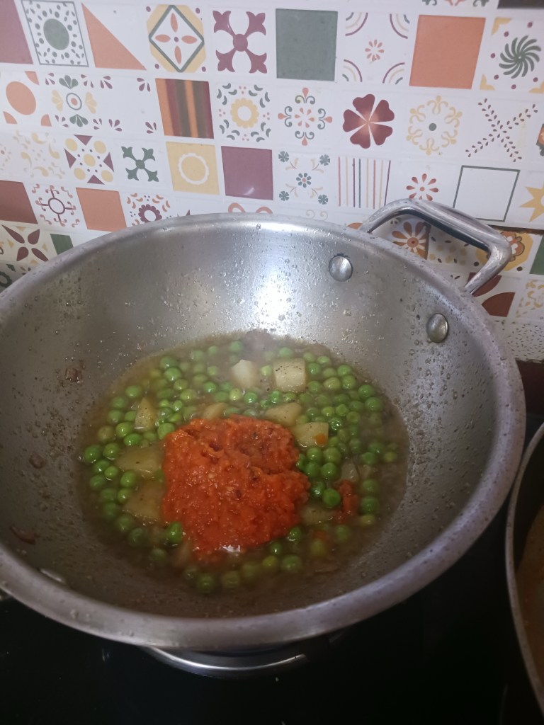 Step 10. Add some more water in first frying pan with green peas and add the cooked tomatoes into this pan.