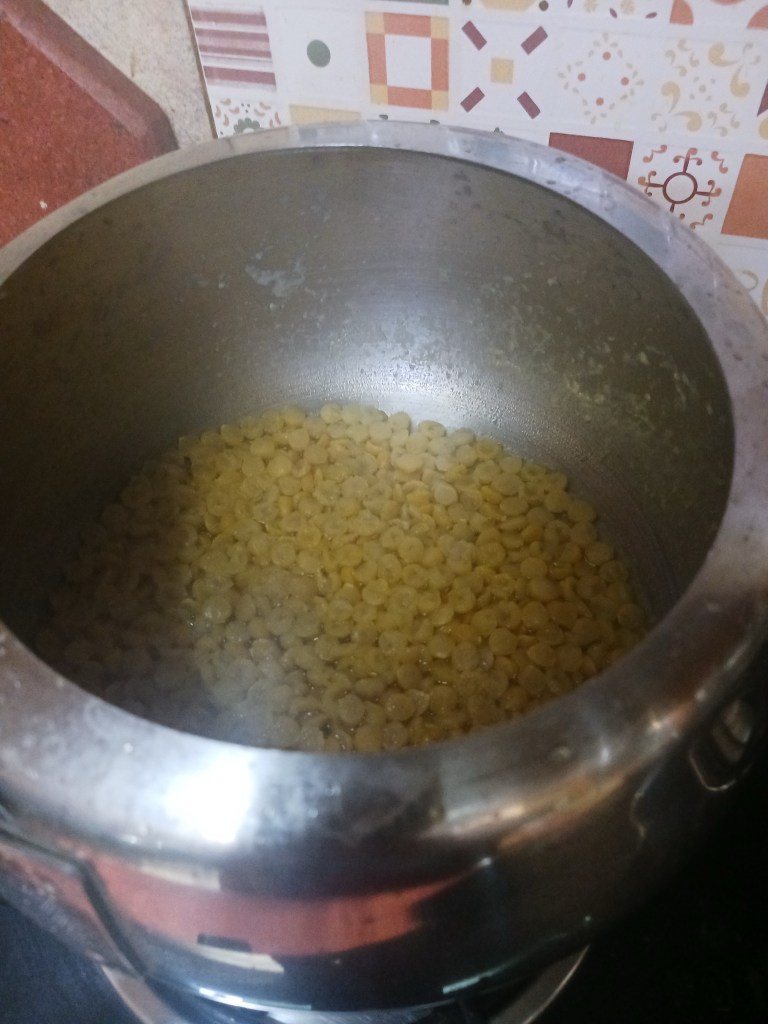 Step 12. By now the split chickpeas lentils had 2 cooker whistles on slow heat and the gas vapors are out. Open it. It’s boiled now.