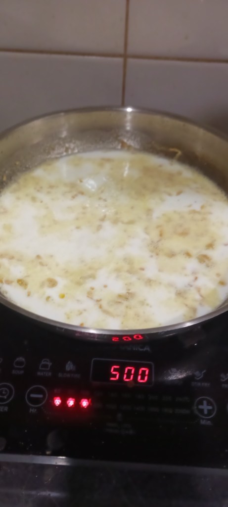 Step 13. Add this milk in pan once the four is cooked in oil and butter. Keep mixing water with the spatula.