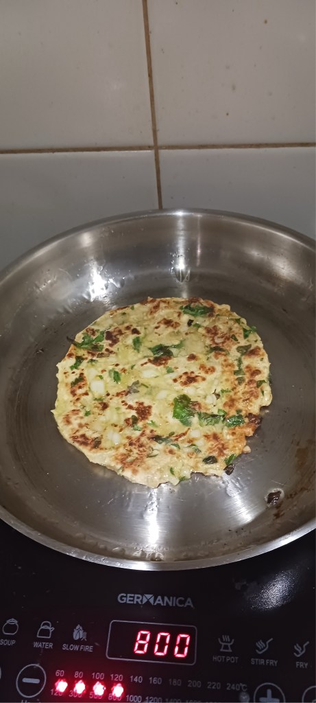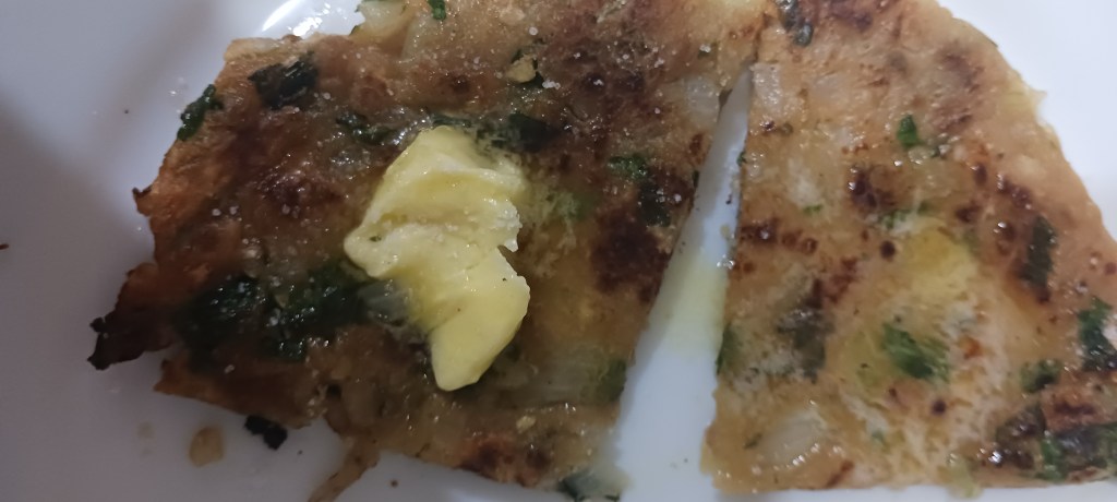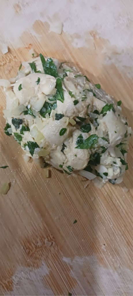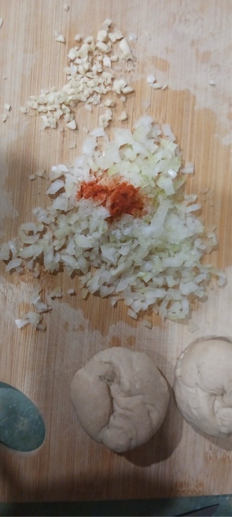 Ingredients: Kneaded dough, half onion, salt, red chilli, olive oil, fresh parsley. That’s it for delicious treat!
