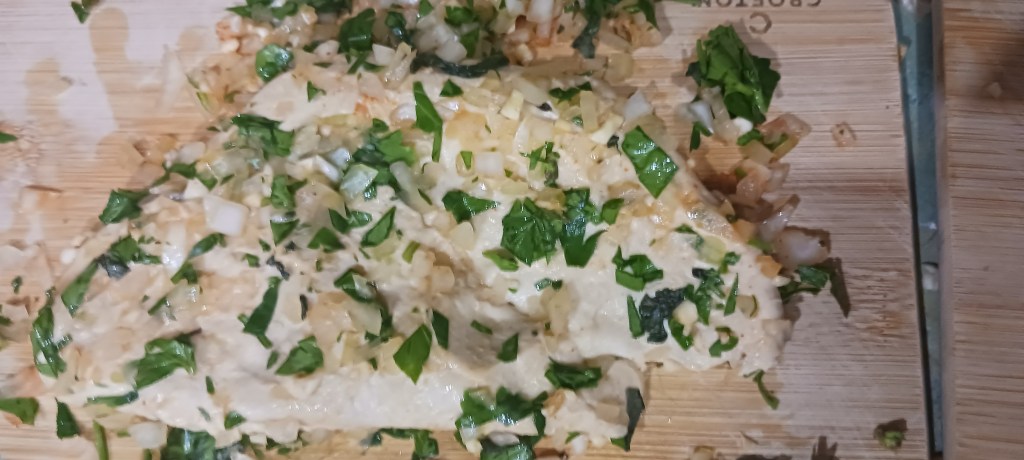 Step 6. Mix chopped green parsley-basil with chopped onion-garlic on wooden chopping board.