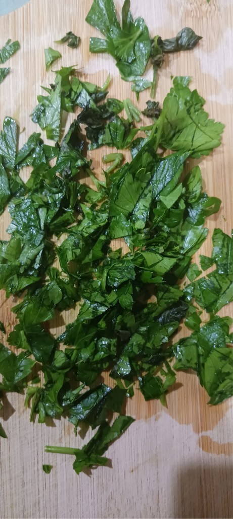 Step 5. Take half handful of fresh green parsley and fresh green basil leaves. Chop it on a wooden chopping board into small part.