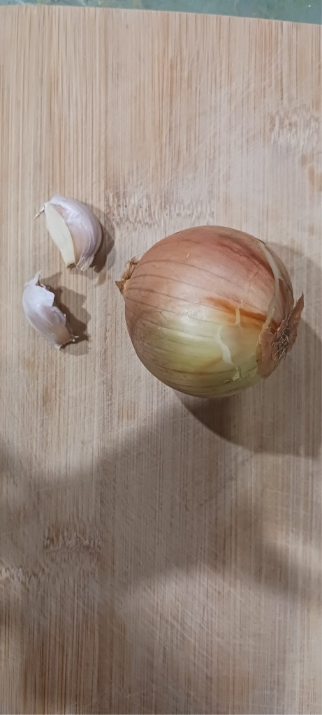 Step 2. Chop half onion on a chopping board, chop garlic cloves as well into small parts.