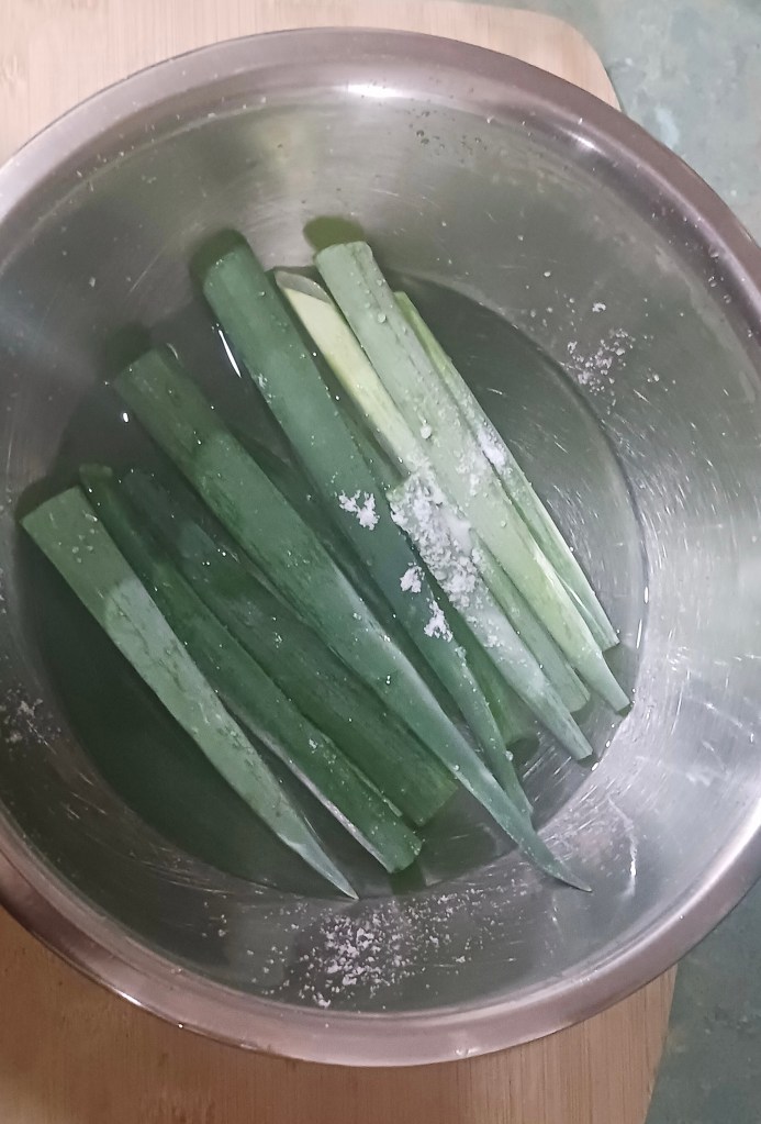 Step 2. Dip spring onions in water with salt for 5 minutes.