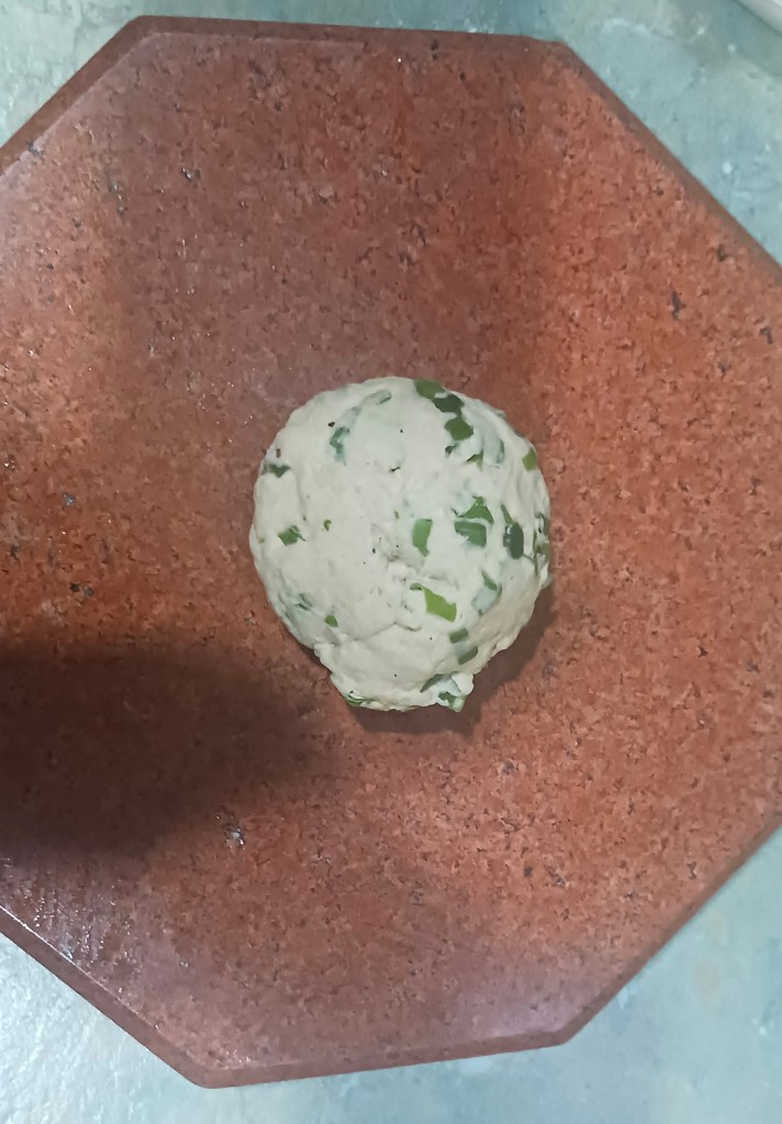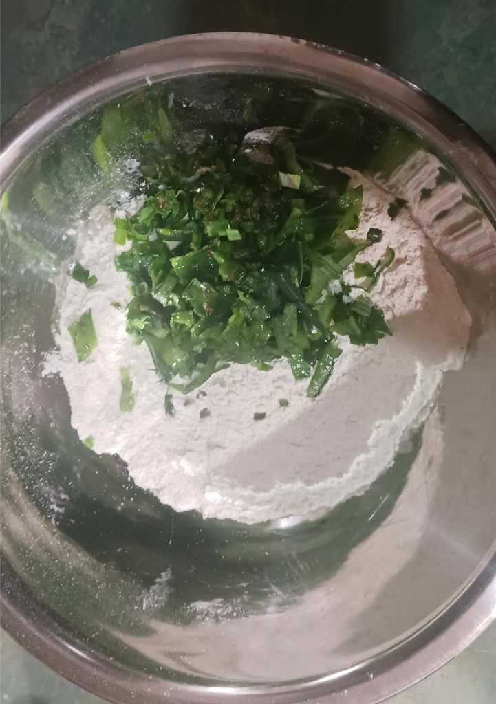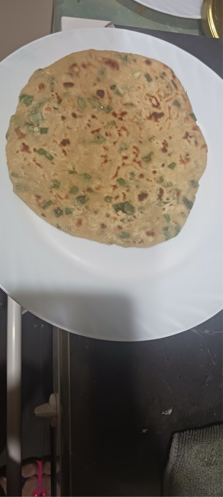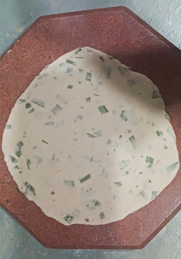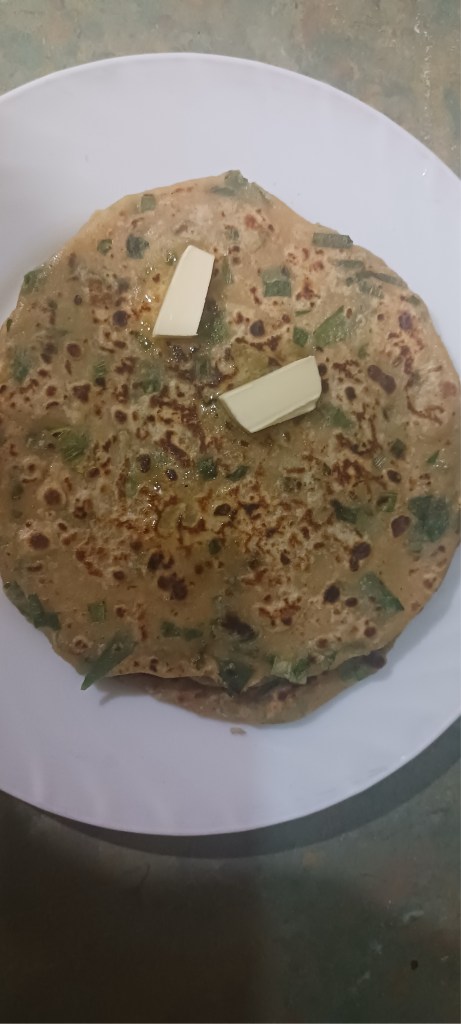 Ingredients: Spring onions, wheat flour refined or unrefined, salt, chilli red or green, butter/clarified butter/cooking oil. That’s it!