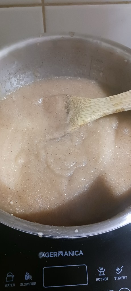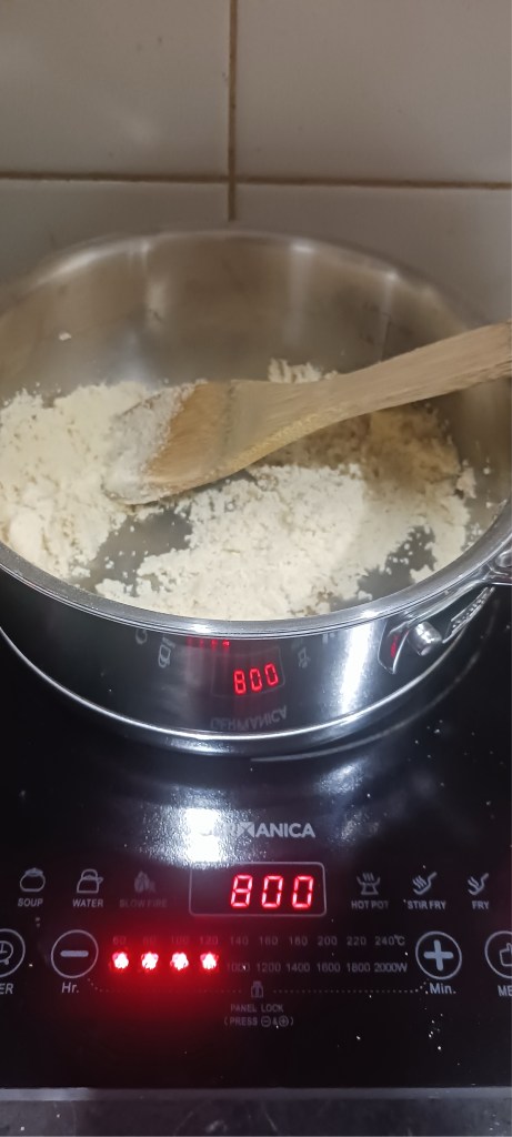Ingredients: 2 small bowls of granulated wheat, 2 small bowls of sugar of your choice, butter/ clarified butter/cooking oil.