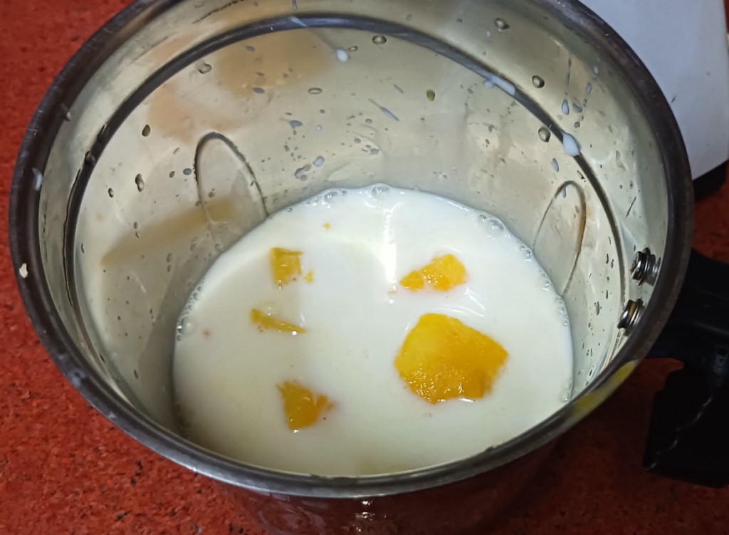 Step 4. Add this one glass of milk and the cut mangoes in a mixture grinder and make the shake in mixture grinder.