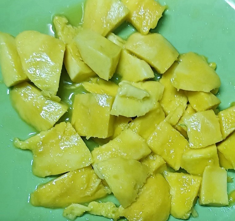 Step 2. Peel the mangoes with a knife and cut the peeled mangoes into small parts.