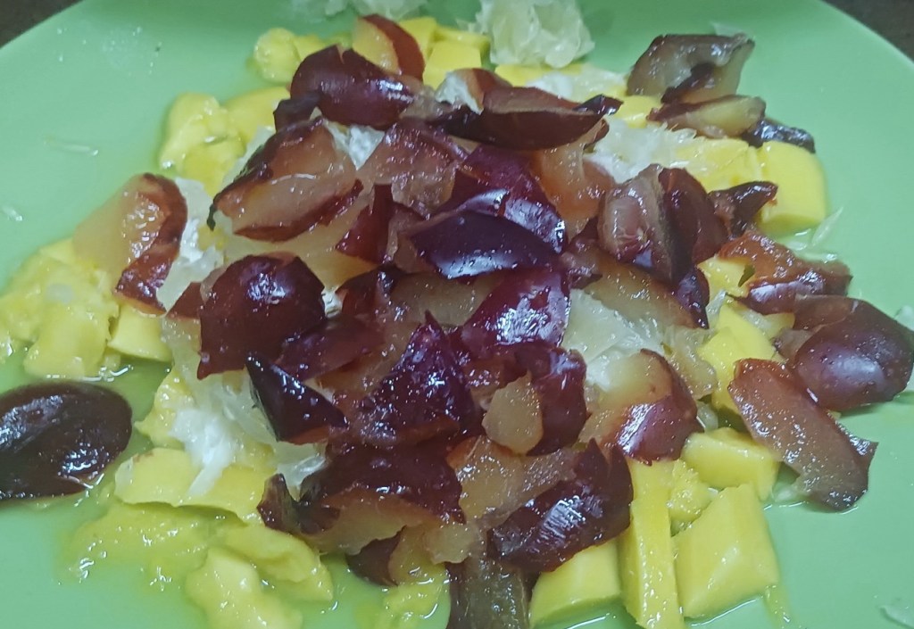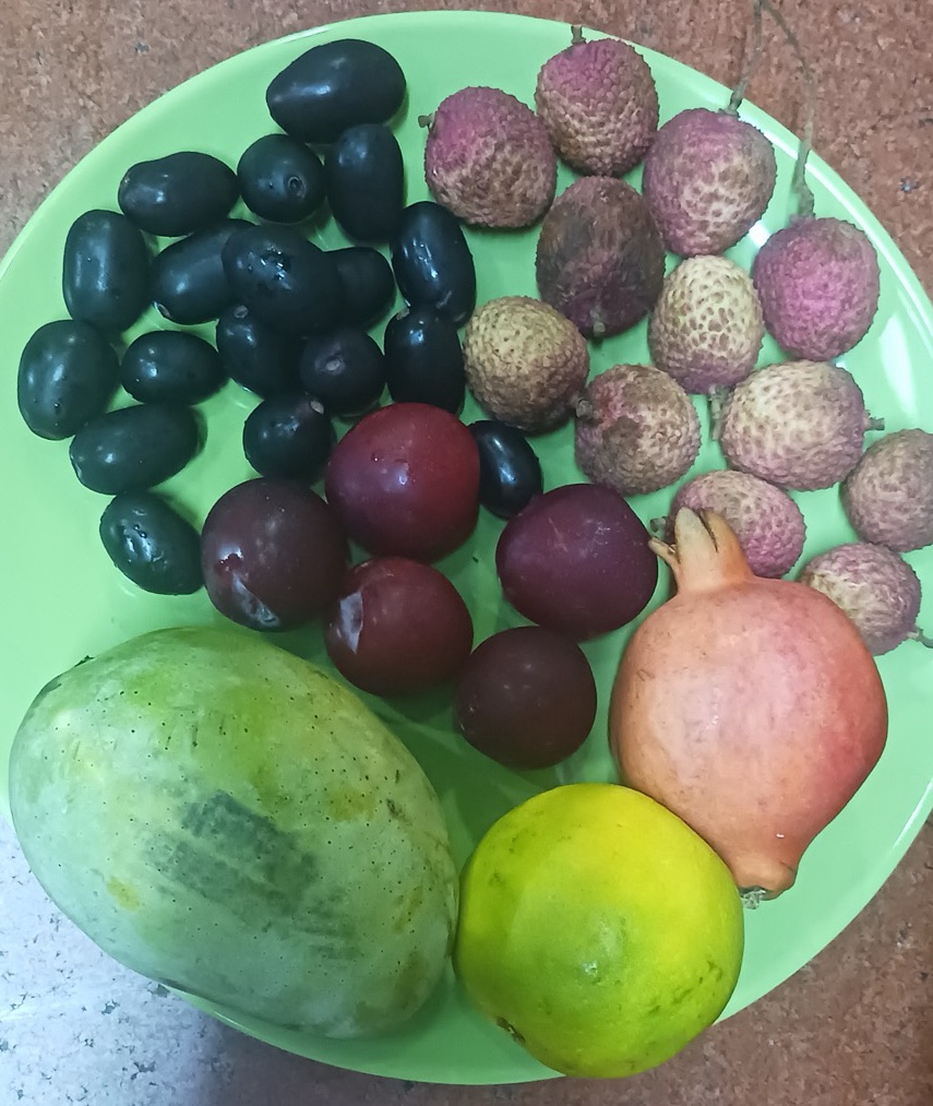 Ingredients: Twelve Lichi, handful of Java Plum, five plums, one Limetta, one pomegranate, one mango and three spoons of white sugar. All fruits to be used should be cold just out of fridge.
