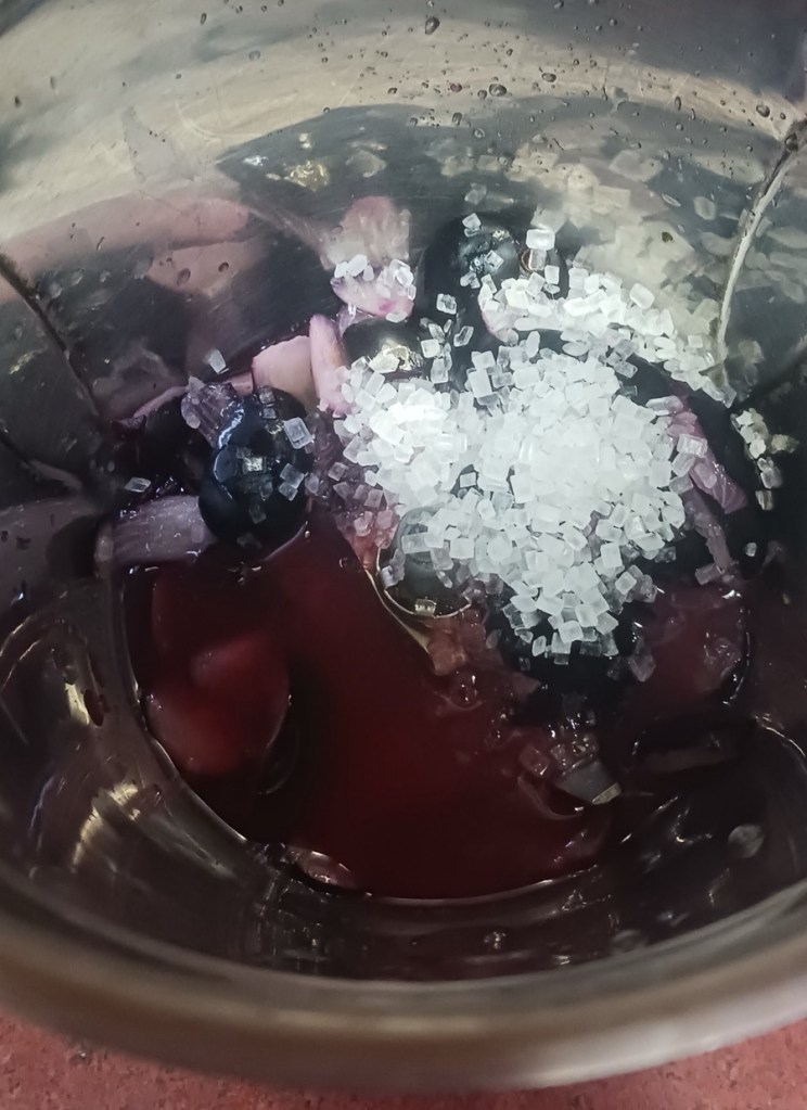 Step 9. Put the cut Java Plum, the pomegranate juice made above and two spoon of white sugar crystals in a mixture grinder and make a nice paste out of it.