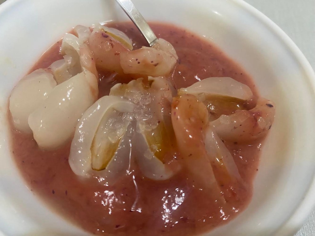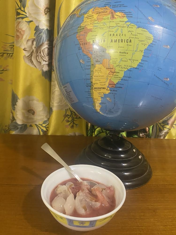 Look, these are Lichi fruit, as in Lichi cut with knife on vertically once and opened and the Lichi seed being taken out with hands, all these embroidered on a fruit mashup mix. The fruit mashup mix is basically a well thought of a well made up mixture of some nice fruits I had and some fruit juice with two spoons of sugar.