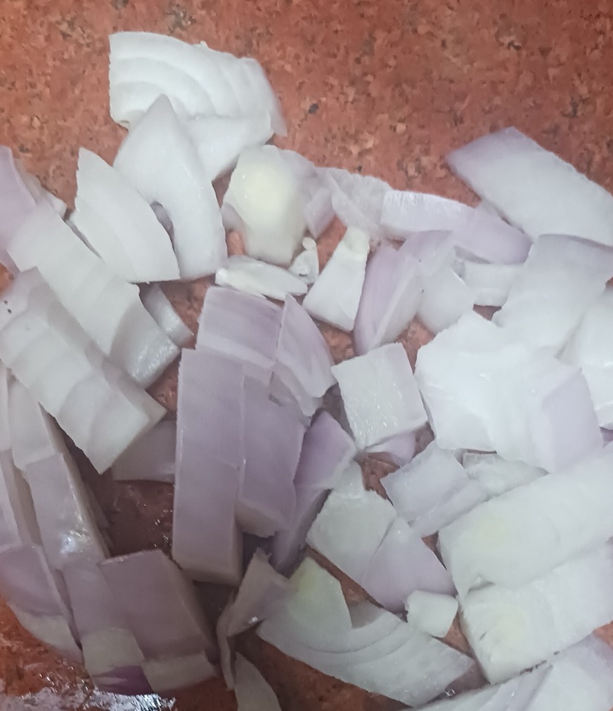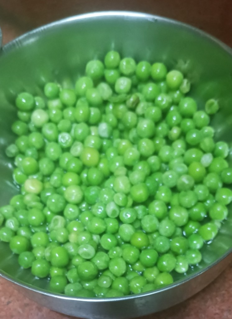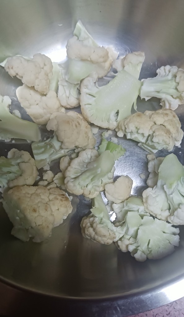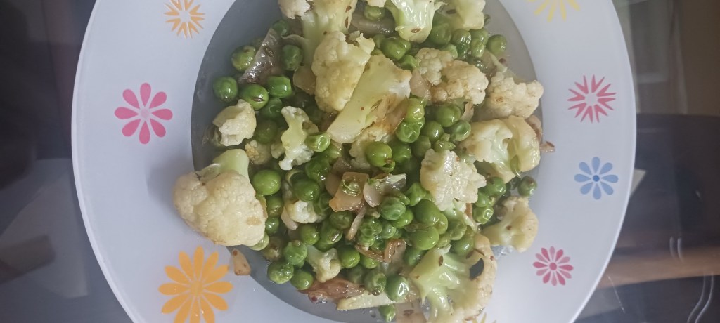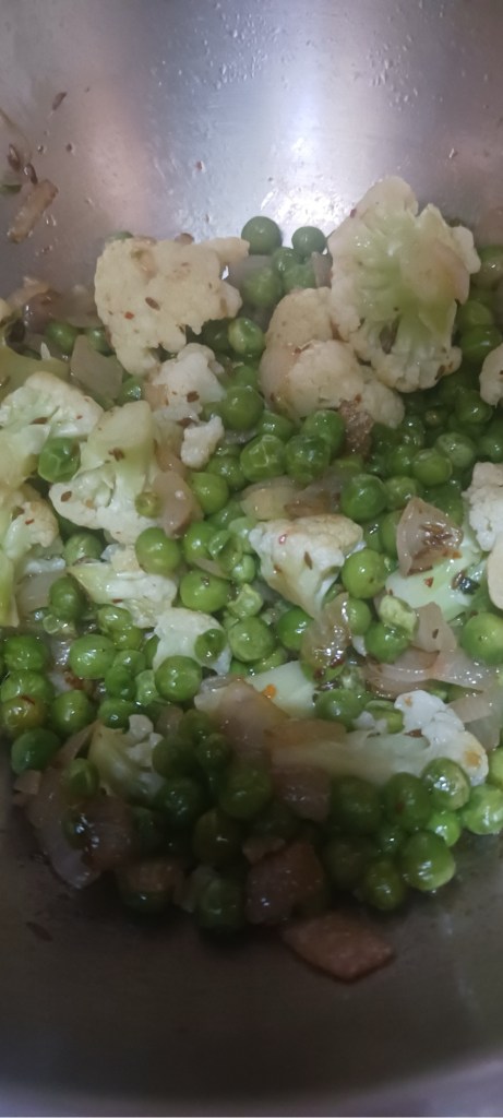 Ingredients: One small cauliflower, one onion, 150grans frozen green peas, salt, 5 tablespoons cooking oil and red chilli. That is it.