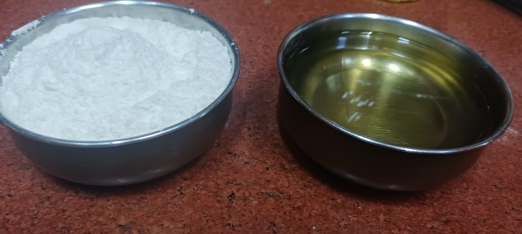 Step 1. Take two bowls of refined flour, one bowl of refined oil. Take same bowl for all measurements.