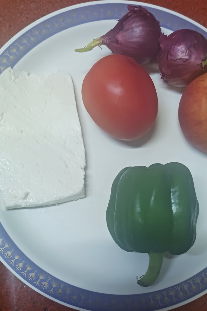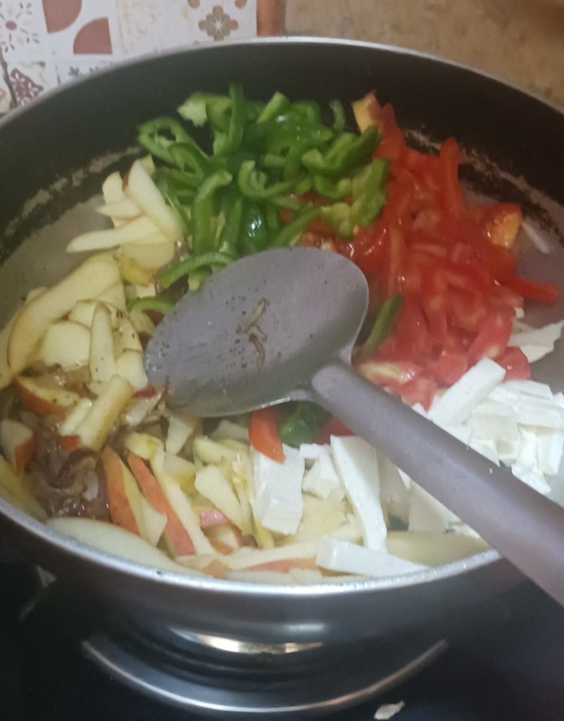Ingredients: 100 grams cottage cheese, one capsicum, one tomato, one apple, two onions, cooking oil, salt, black pepper.