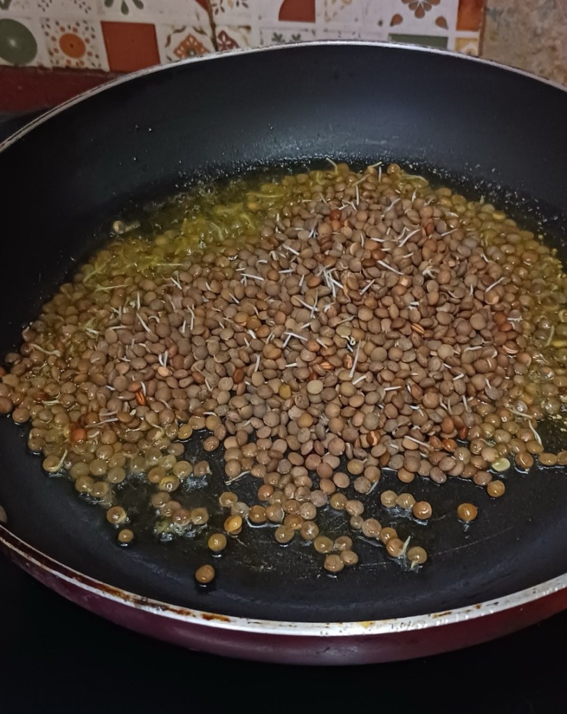 Step 5. Add brown sprouted lentils into frying pan now.